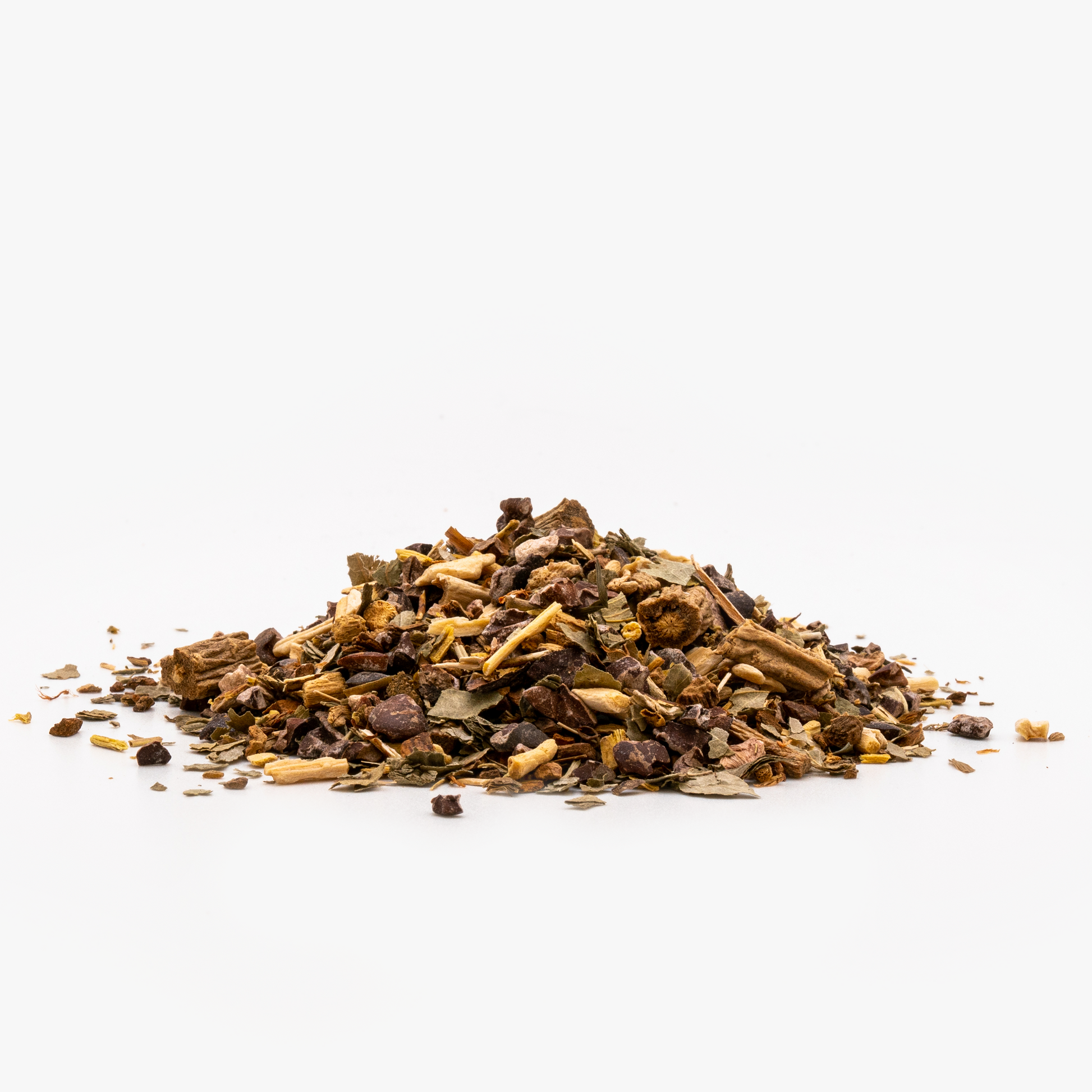 Raw Cacao Nibs, Cinnamon, Shatavari, Sarsaparilla, Licorice, St John’s Wort, Codonopsis, Rhodiola, Lady’s Mantle & Anise Seed